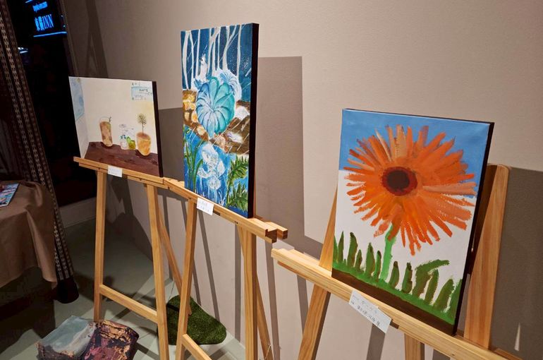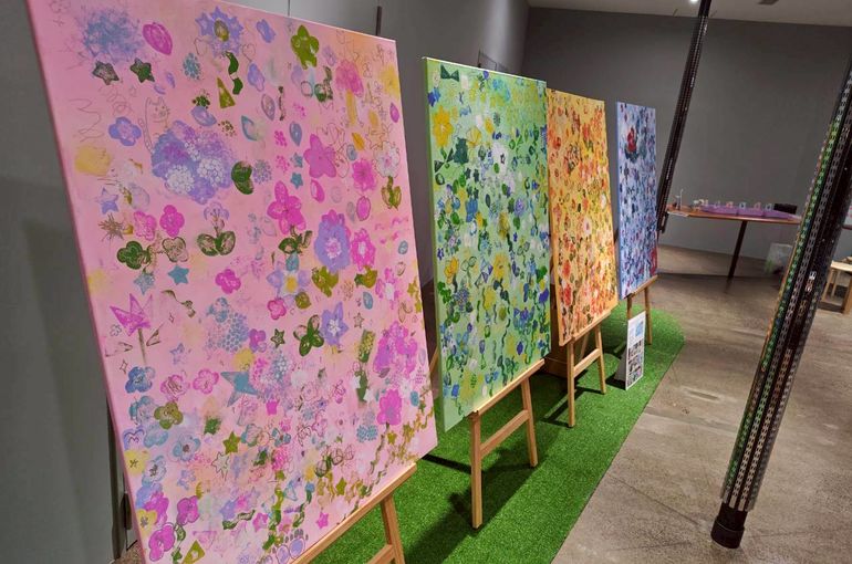 ワークショップ「みんなで大きなキャンバスに絵を描こう!参加型ライブペインティング」の作品も展示。