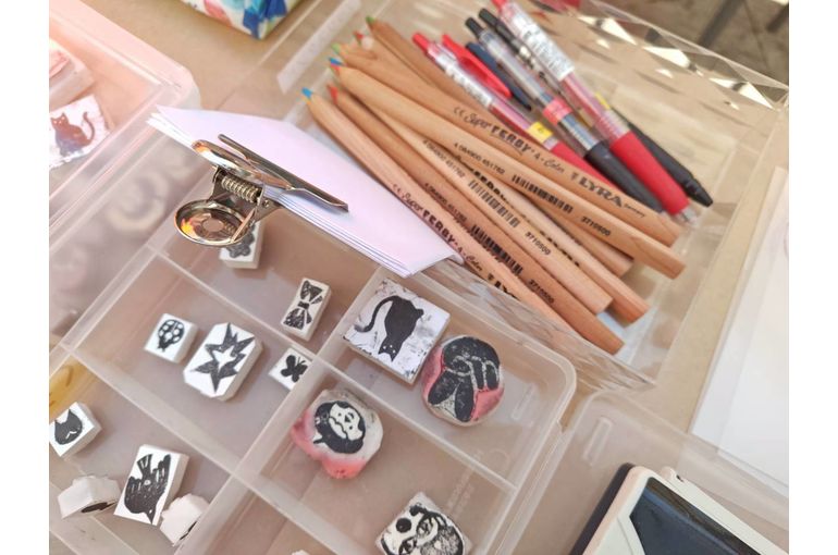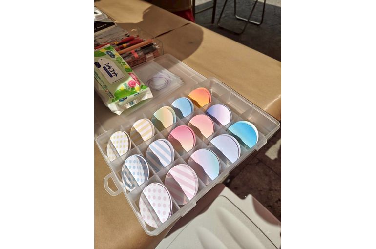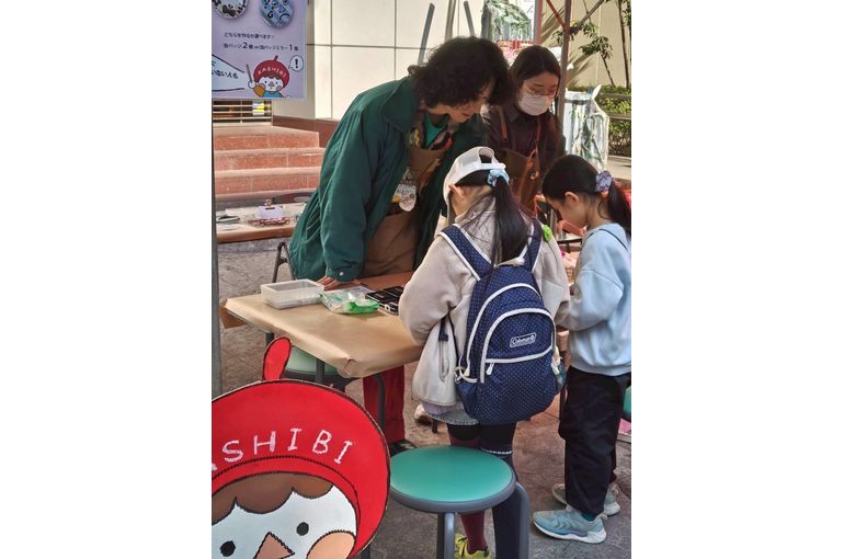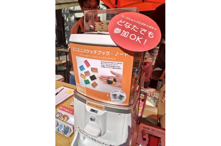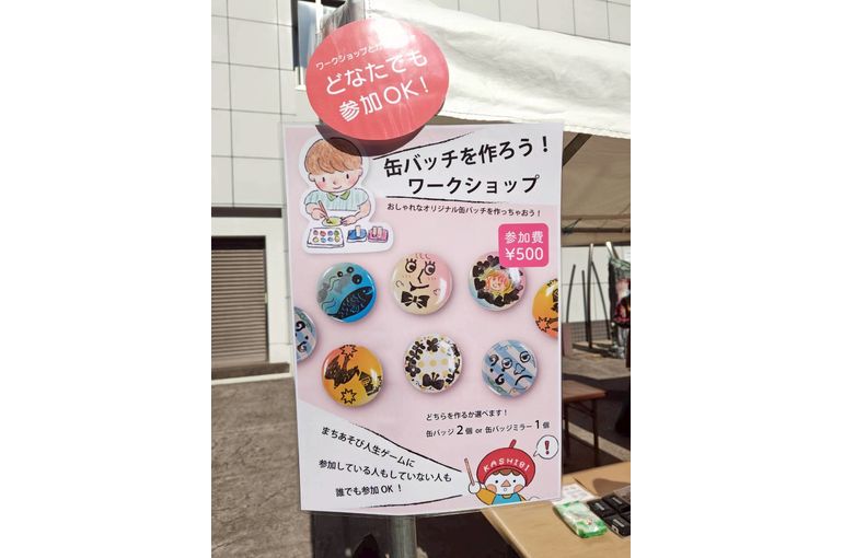 マルマンアート学院カルチャー教室の出展は、通常の人生ゲームに加え、「お買い物スタンプラリー」カテゴリにも参加し、マルマンイベント限定・ミニミニスケッチブックノートと、かしびまるステッカーが当たるガチャガチャや、その場で絵を描いたり、スタンプを押した色紙を缶バッジに(缶ミラーにも!)することができるワークショップも開催しました。